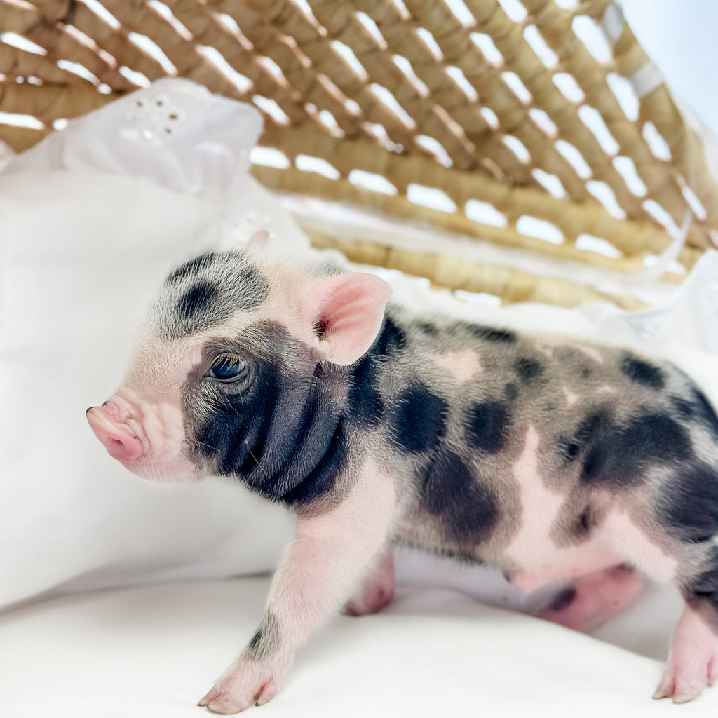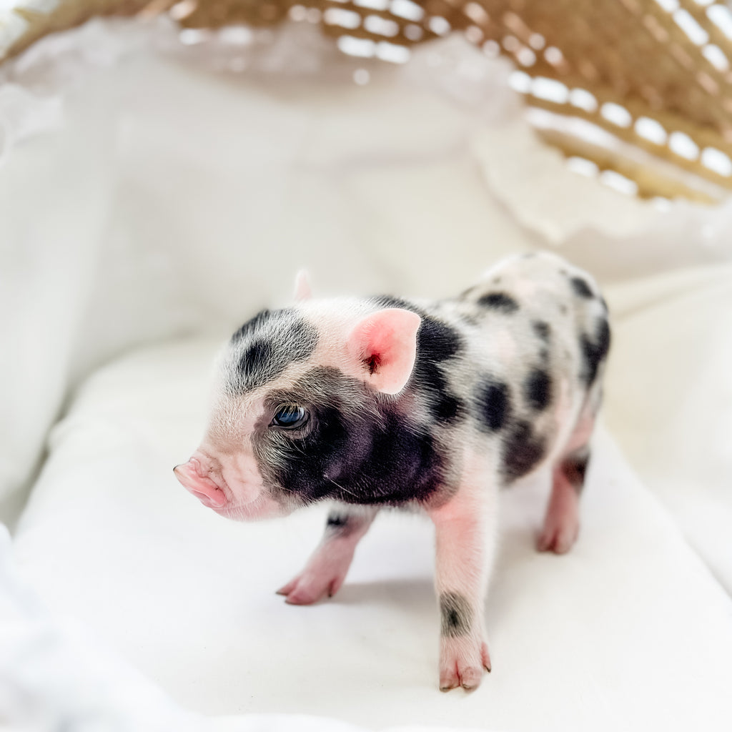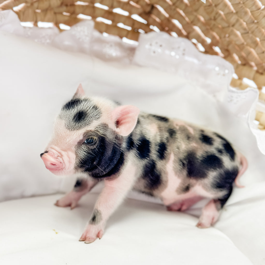 Meet Colonel Cheerio, a distinguished little piglet with a light pink coat covered in bold black spots and a charming pink-and-black snout. He’s full of personality, with a playful and curious nature that’s sure to keep you smiling. Colonel Cheerio has a special way of capturing hearts with his unique look and endearing charm. He’s ready to march into a loving home and make it his forever kingdom! Both parents of this baby are XXS.