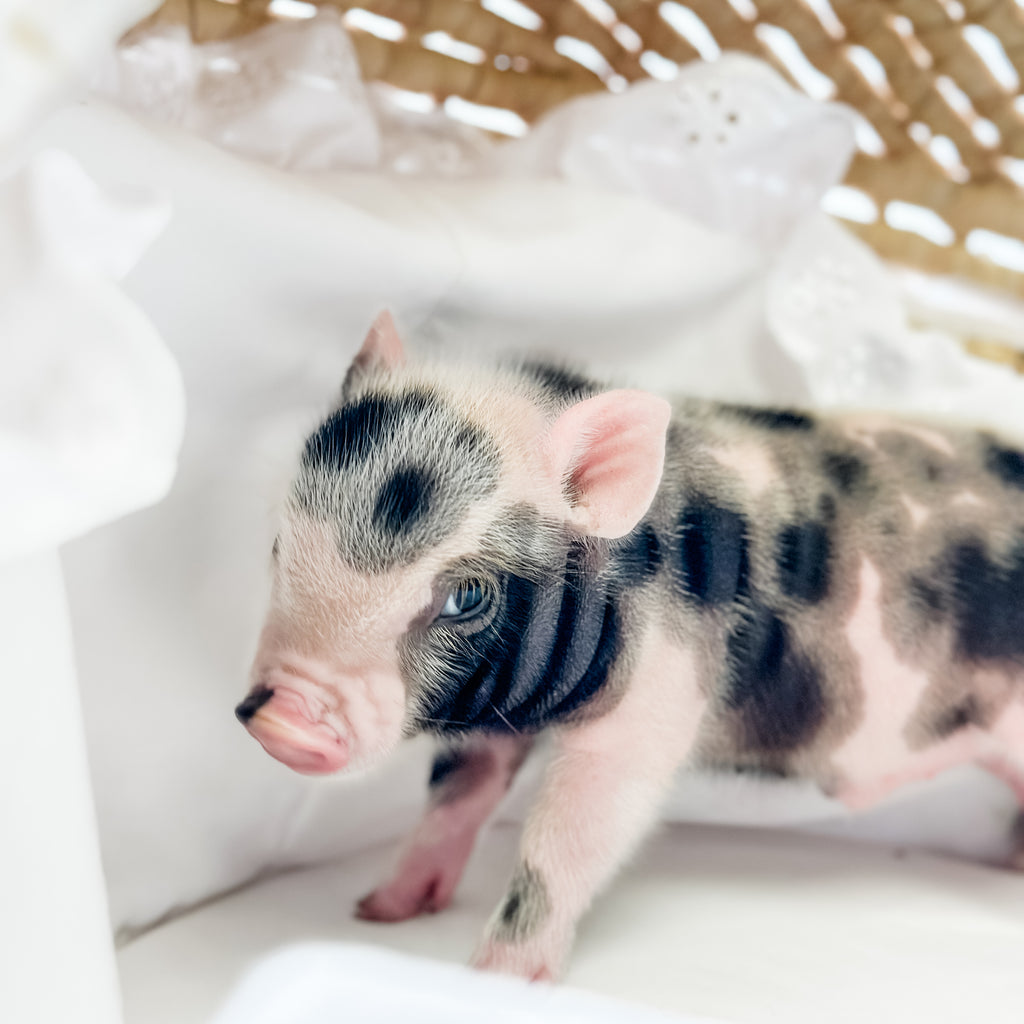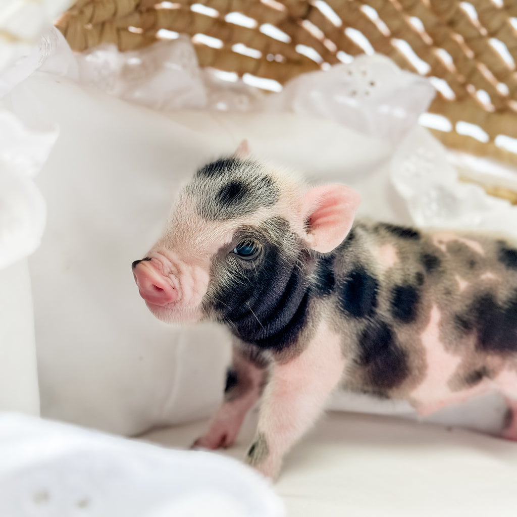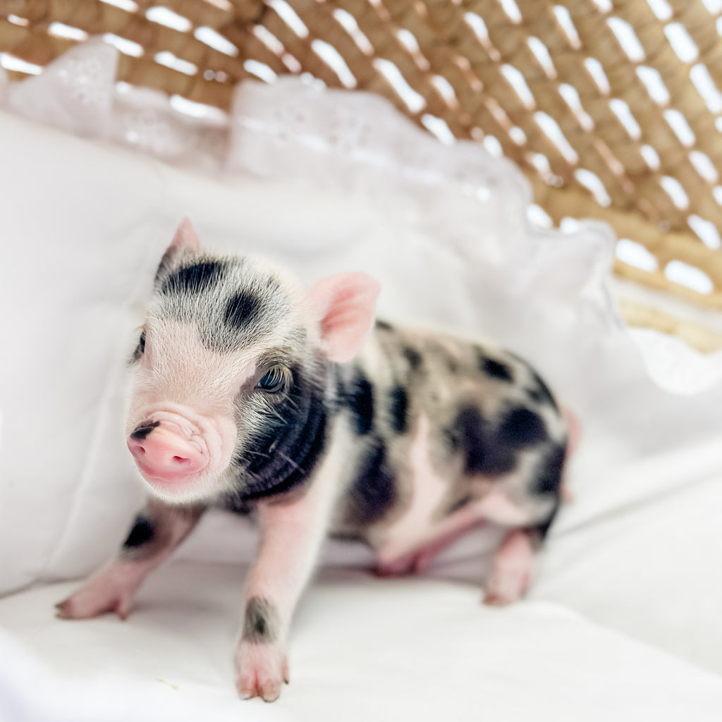 Meet Colonel Cheerio, a distinguished little piglet with a light pink coat covered in bold black spots and a charming pink-and-black snout. He’s full of personality, with a playful and curious nature that’s sure to keep you smiling. Colonel Cheerio has a special way of capturing hearts with his unique look and endearing charm. He’s ready to march into a loving home and make it his forever kingdom! Both parents of this baby are XXS.