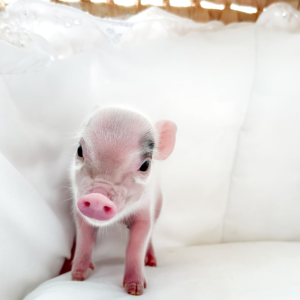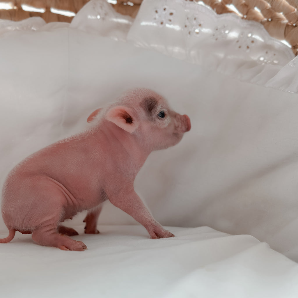 Introducing Princess Donut, our adorable mini piglet adorned with small black spots on her head against a backdrop of soft pink. Her charming appearance is sure to capture your heart and brighten your day. With a playful spirit and a cheerful personality, Princess Donut is ready to bring endless fun to your family. Welcome this delightful little sweetheart into your home and watch her sprinkle happiness everywhere she goes!